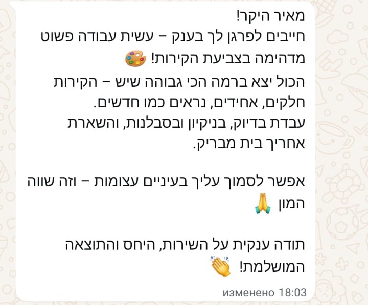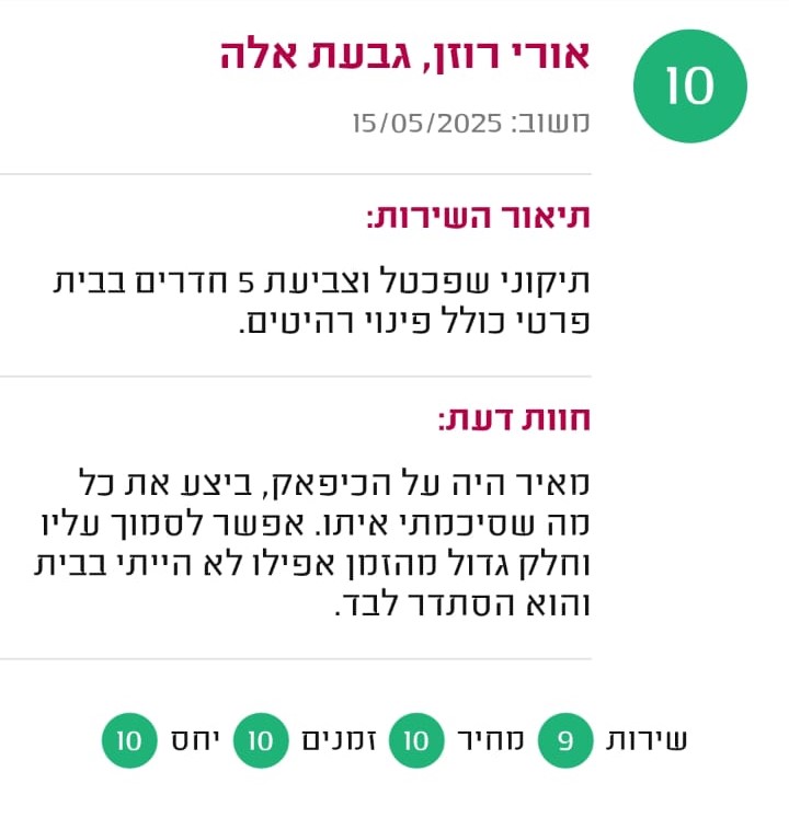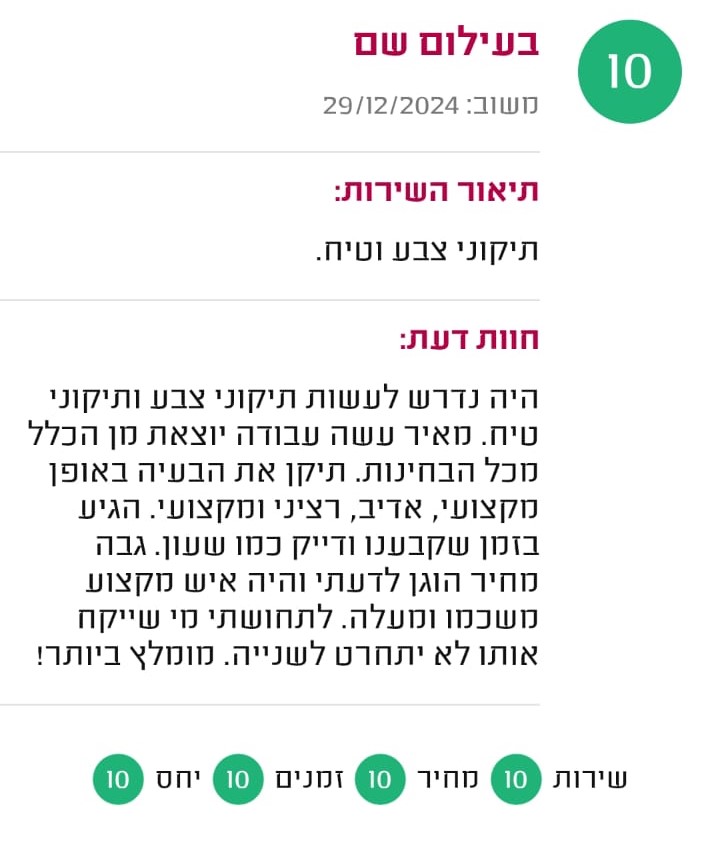 כל עבודה מלווה באחריות מקצועית לתקופה מוגדרת, בהתאם לסוג העבודה והחומרים.